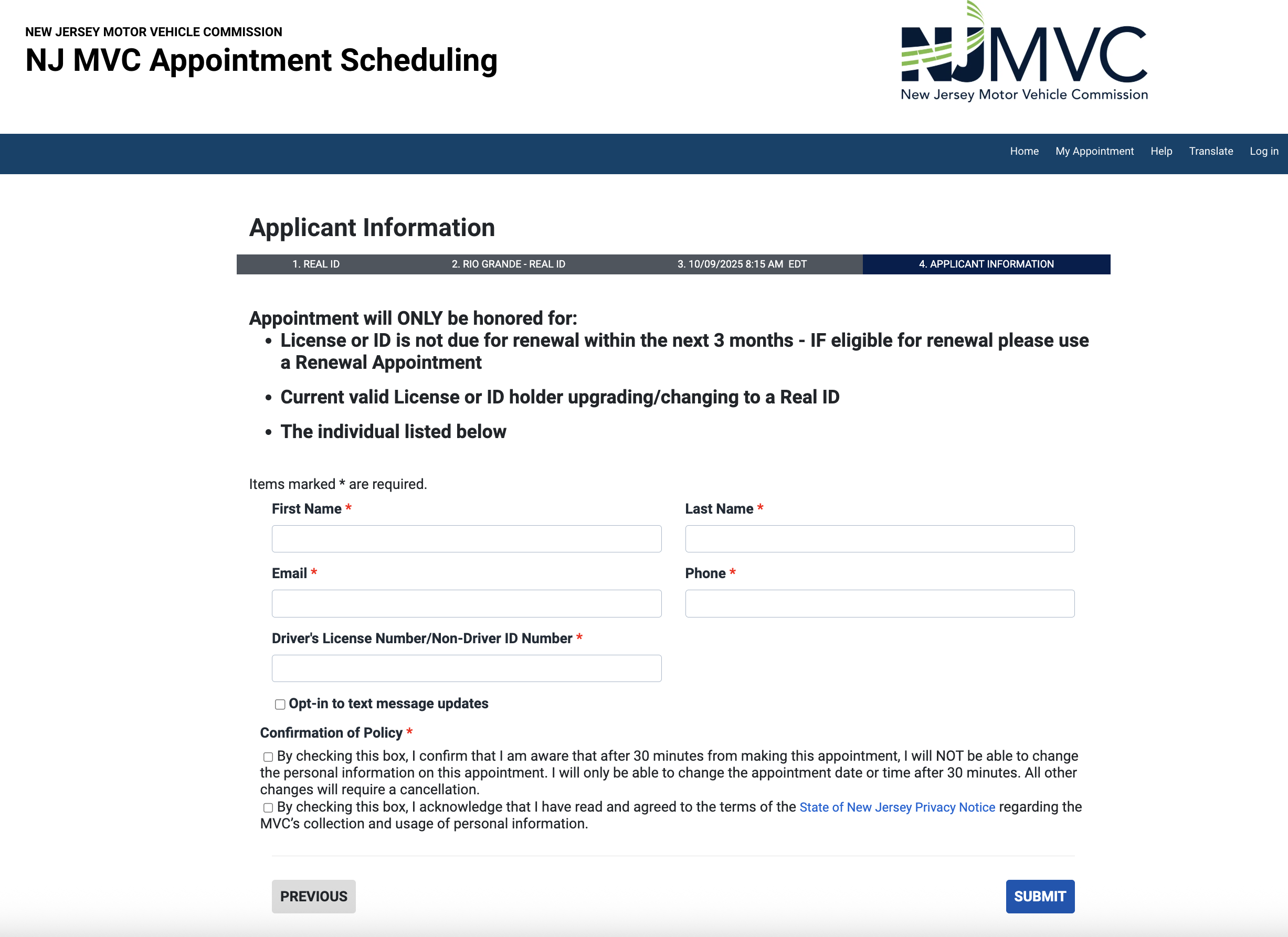 - NJ MVC 공식 웹사이트에 접속해 Real ID 사전 신청서를 작성합니다.